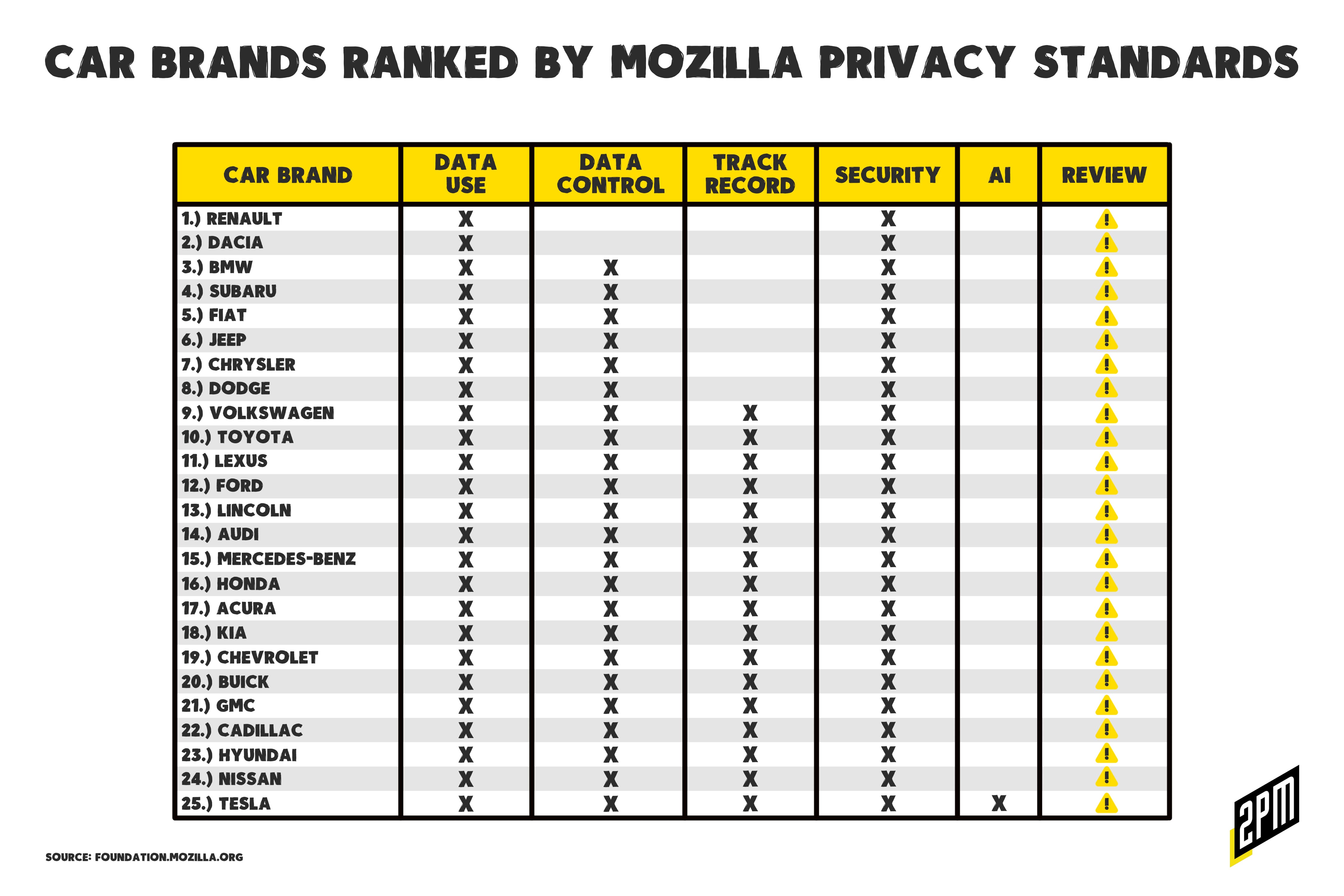 Cars, with their sophisticated infotainment systems, sensors, and connectivity features, were capturing data ranging from driving patterns and destinations to personal conversations and even, alarmingly, indications of a driver’s sex life. Mozilla’s research found that every one of the 25 car brands they examined was collecting more data than deemed necessary. To add to the consumer’s woes, most car manufacturers were sharing, and in many cases selling, this data to third parties. Such extensive and intrusive data collection far outstripped even the most data-hungry social media platforms pre-GDPR. Here is the report card: